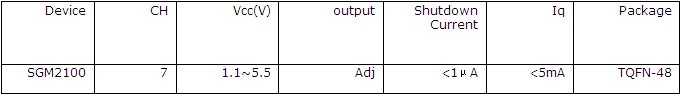 SGM2100的工作電壓為1.1~5.5V,具有以下優(yōu)點(diǎn):輸入電壓低至1.1V;輸出電源多達(dá)7路;兼具升降壓DC/DC;1.1V升壓轉(zhuǎn)換效率在2A負(fù)載的情況下可以達(dá)到90%;降壓DC/DC通道,負(fù)載在1A條件下,效率可以達(dá)到90%;LED驅(qū)動具有過壓保護(hù)功能;DC/DC開關(guān)頻率高達(dá)1MHz;7路輸出單獨(dú)控制,關(guān)斷模式電流低至1μA;具有軟啟動、電源狀態(tài)指示和過載保護(hù)功能。