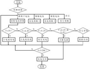 对于不同的电池和不同的参数,单片机需要设定不同的充电参数,选择不同的充电策略。另外,程序需要在电池过电流、过电压等异常情况下强制终止充电。以锂离子电池为例,一般采用恒流-恒压充电方式,其充电过程包括小电流预充电、大电流充电、恒压充电等几部分。其充电控制程序流程图如图4所示。
