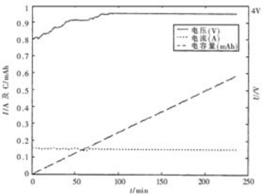 选用NOKIA6100锂离子电池(额定容量为550mAh),用恒流-恒压充电方式进行充电,取恒流充电电流为0.15A,截止电压为4.2V,充电曲线如图6所示。