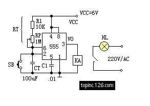 按一下按鈕開關SB之后,定時電容CT立即放到電壓為零。于是此時555電路等效觸發的輸入成為:R=0、S=0,它的輸出就成高電平:V0=1。繼電器KA吸動,常開接點閉合,曝光照明燈點亮。按鈕開關按一下后立即放開,于是電源電壓就通過RT向電容CT充電,暫穩態開始。當電容CT上的電壓升到2/3VCC既4伏時,定時時間已到,555等效電路觸發器的輸入為:R=1、S=1,于是輸出又翻轉成低電平:V0=0。繼電器KA釋放,曝光燈HL熄滅。暫穩態結束,有恢復到穩態。
