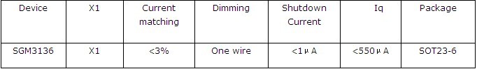 SGM3136作為圣邦微電子新近推出的低壓差模式白光LED燈驅動,相對市場上現有同類產品在性能上做了充分的改善,壓差降低到20mA電流條件下約為35mV(TYP),可以完美支持3顆LED在較低的電池電壓下(<3.5V)穩定工作,工作電壓為2.5~5.0V, 通道間電流匹配度誤差小于3%,可以實現模組均勻亮度背光。支持單線脈沖調光,可以實現16級調光,關斷模式下,靜態電流小于5μA,可以充分滿足各種便攜產品的應用。